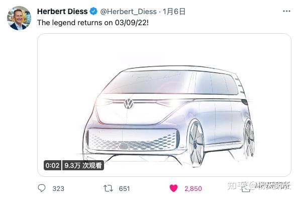 7 t/ d) z D7 L c0 l( ^" v再后面我在TWITTER上见到大众汽车CEO赫伯特·迪斯亲自为ID.Buzz量产版预热——3月9日,传奇归来!