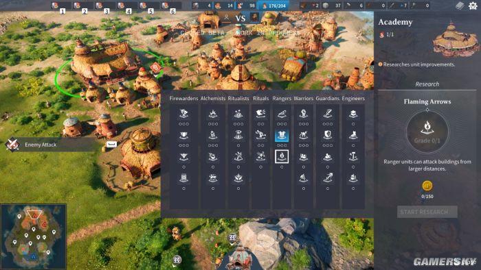 % H! k0 @7 X( c/ X在建造学院后,玩家就可以通过研究科技来提升兵种的实力。遗憾的是,本作的科技树不仅在UI上显得有些简陋,其类似魔兽、星际的“三攻三防”升级内容也显得有些缺乏新意。8 e Y5 \' h) n9 N) v