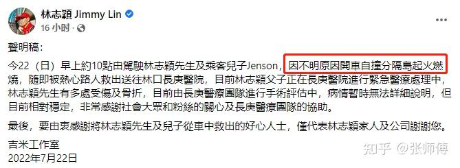 2 ]1 h; Z/ P8 Y$ X看到一张林志颖官方脸书的截图,上面说了【因不明原因开车自撞分割岛起火燃烧】。这个【不明原因】就很值得深思了。