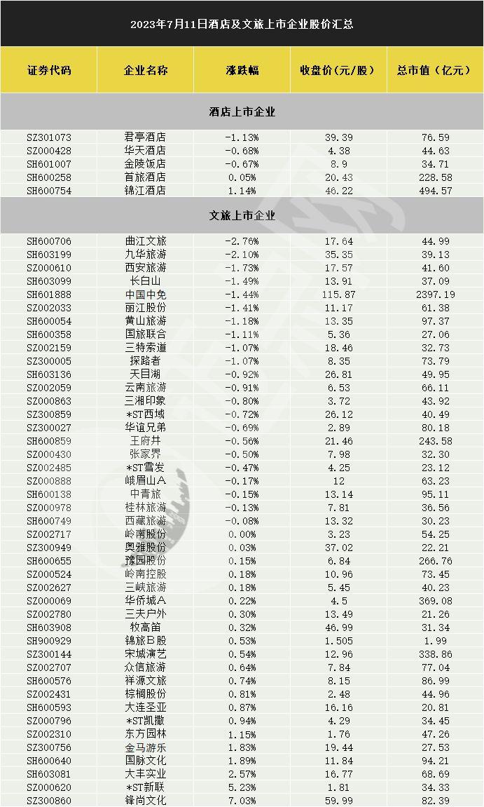 酒店个股方面,君亭酒店(SZ:301073)收跌1.13%,报收39.39元/股;华天酒店(SZ:000428)收跌0.68%,报收4.38元/股;金陵饭店(SH:601007)收跌0.67%,报收8.90元/股。