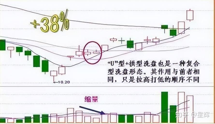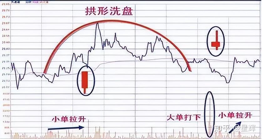 拱型洗盘是指股价全天走出一种:低开——高走——再低收的分时走势。盘口特征多为小单拉高、大单打低,打低的目的是为了吓出获利盘,上下买卖均成小单景象。