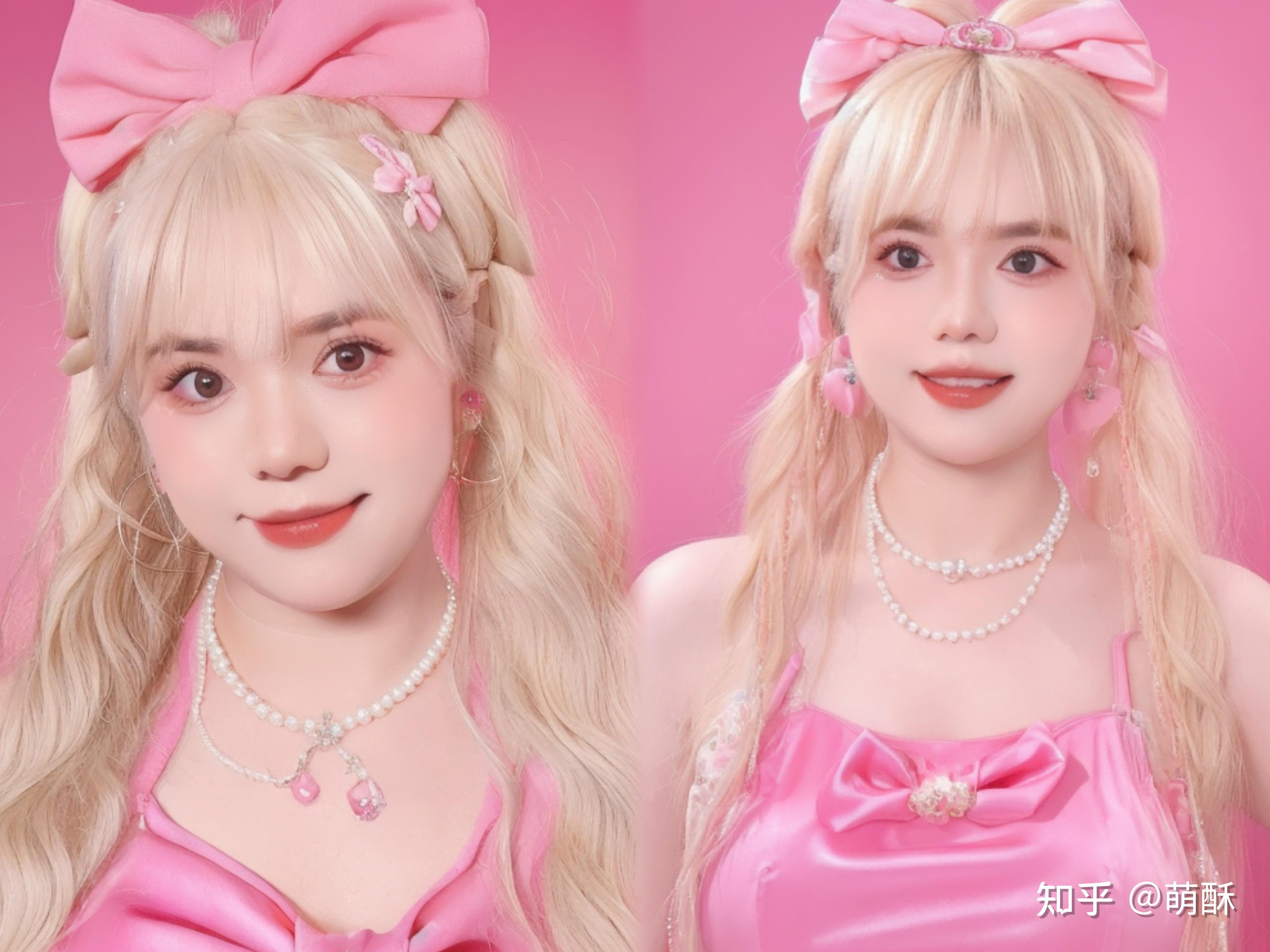 那现实整体上要达到这样的AI写真效果,除了皮肤、头发外,还要从妆容、配饰、服装等物上都要和谐搭配。以及,但凡这背景板不是粉色,都会失掉一大半的氛围感。2 R& Z* J7 R( K* B