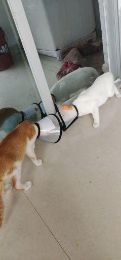 ' W% s6 Y4 g- {) k给它们戴上了耻辱圈哈哈哈哈哈哈,橘猫有点抗拒,白猫依旧很乖。