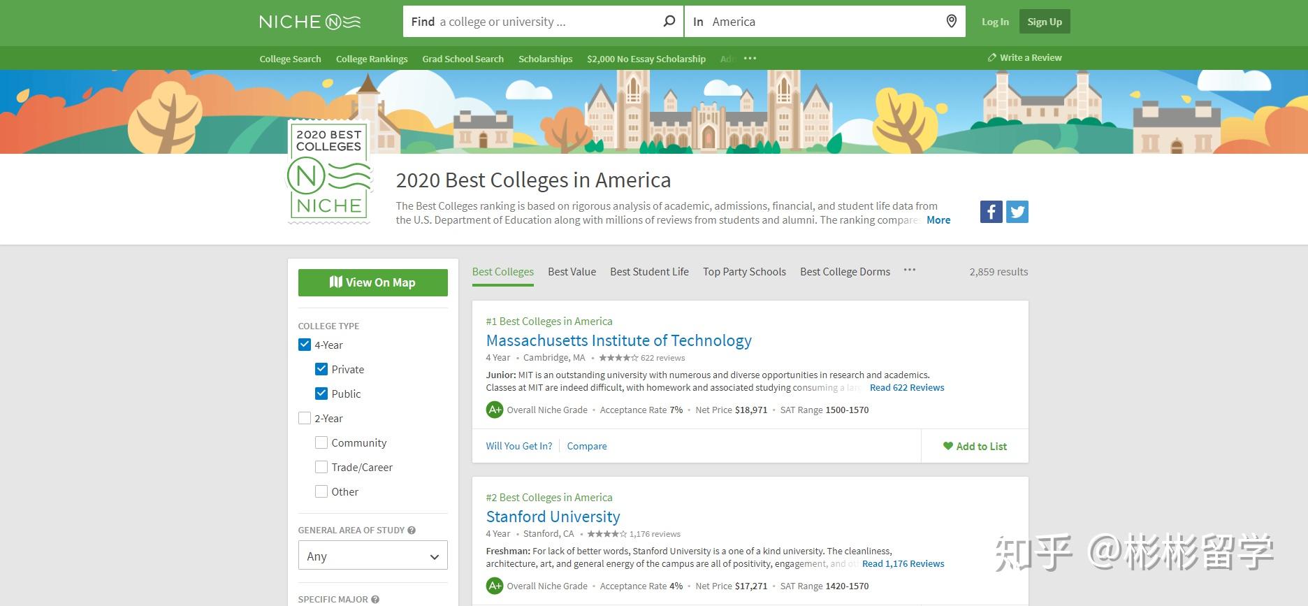 2. 提供了超过800个不同主题的学校排名,你可以在里面找到很多古古怪怪的排名,比如六年后毕业比例最高的学校排名、那些不用贫困证明就可以领助学金(financial aid)的学校、女子羽毛球最强学校……,是不是剑走偏锋的排名呢,如果你有一些独特的爱好或要求,可以来这里看一下哦。9 H# ^3 c- ]3 ]$ f. h
