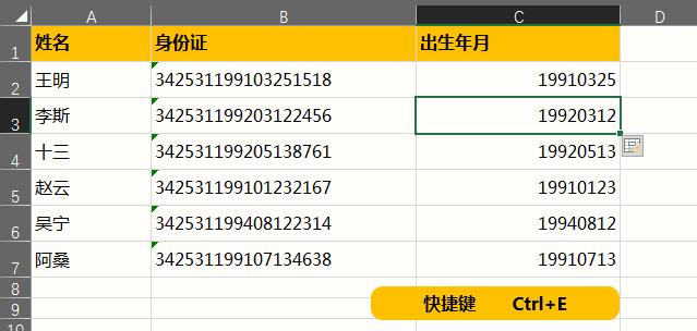 - e+ }# k9 B& {现在只需录入第一个出生日期,然后按快捷键Ctrl+E,只需要一秒就可以将出生日期从身份证信息中提取出来。! w- L8 E# E4 i* c/ G7 J2 T8 t" q