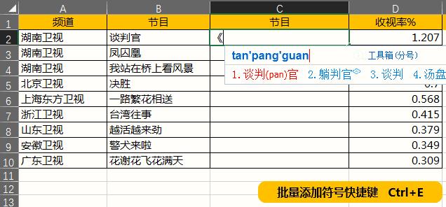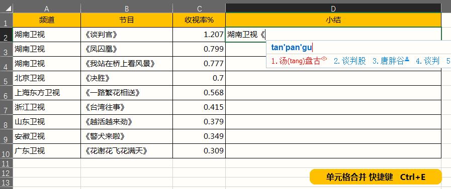 4 r0 n) N4 I) `/ W' i0 Y我们在边上再新建一列,在第一行直接输入“湖南卫视《谈判官》收视率1.207”。然后按快捷键Ctrl+E,即可全部生成。