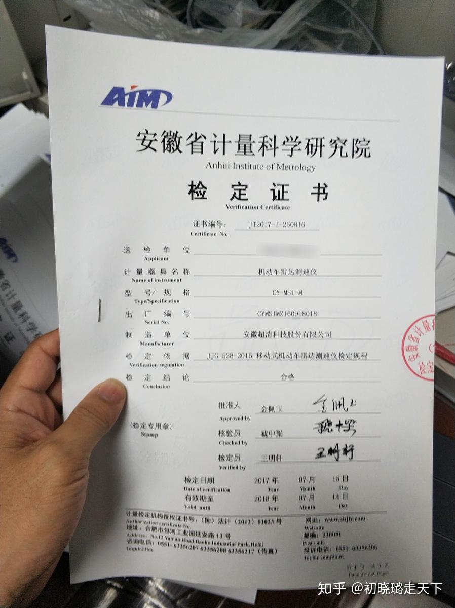 ' _- r+ j+ w' O' | D结果又被支到20km外的B大队,去找这个设备编号:在照片中设备编号3404056696和设备外壳上的编号CYMS1MZ160918018对上了。最后找到了一份检定证书:% e, F( c6 I: D% x8 @