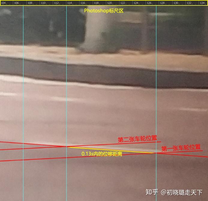 2 t3 d) X% ]" l) u" P; L结合Photoshop里的标尺计算位移占整个虚线的百分比:在Photoshop标尺中,车道分隔虚线左起107.5,右至127.5,长度为20。第一张车轮位置和第二张车轮位置的位移长度为127.5至114,位移长度为13.5。那么在0.13秒内,车辆位移是整个车道分隔虚线长度的:! _9 Q/ ^* F) ?) ]$ Z