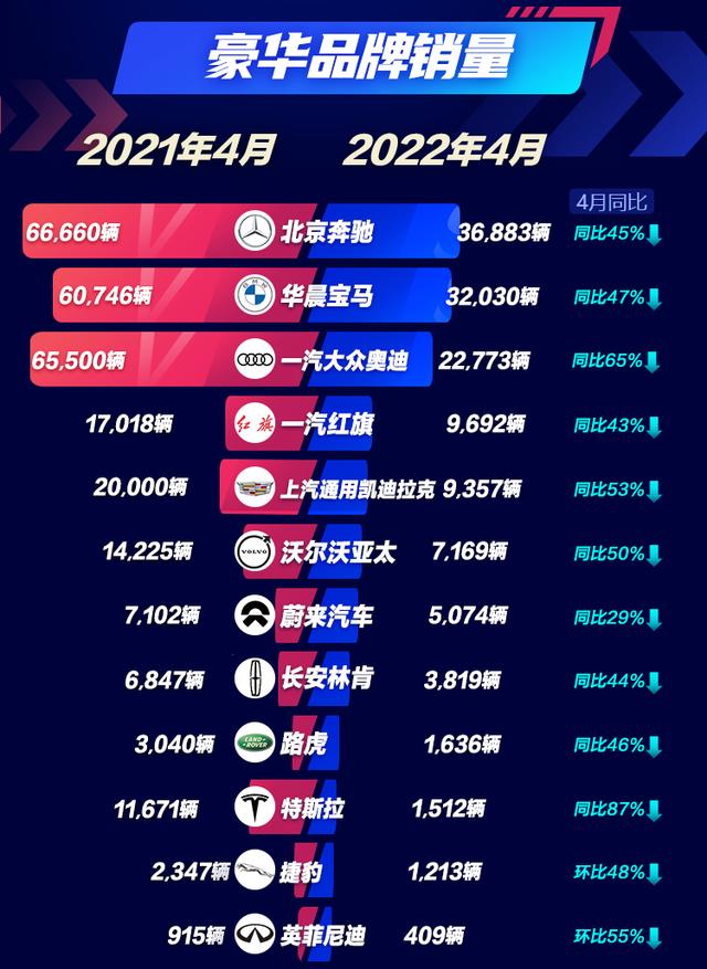 7 ~* Q& v: s( u) p# p$ O其中,轿车领域4月份销量一共52.7万辆,同比下降32%,环比下降31.1%。1-4月累计销量289.5万辆,同比下降11.6%。既然4月轿车销量已经出炉,那今天我们就来看看各大豪华品牌在4月份的销量表现情况如何。