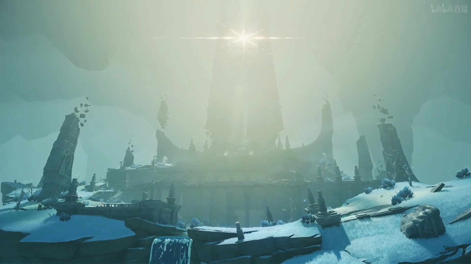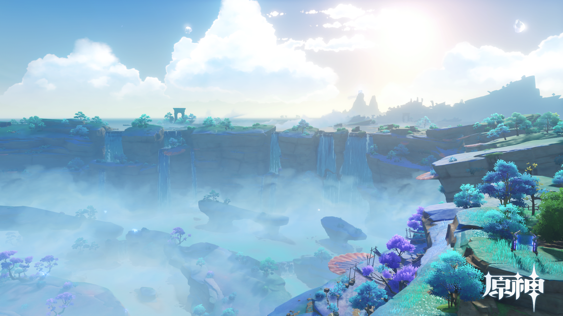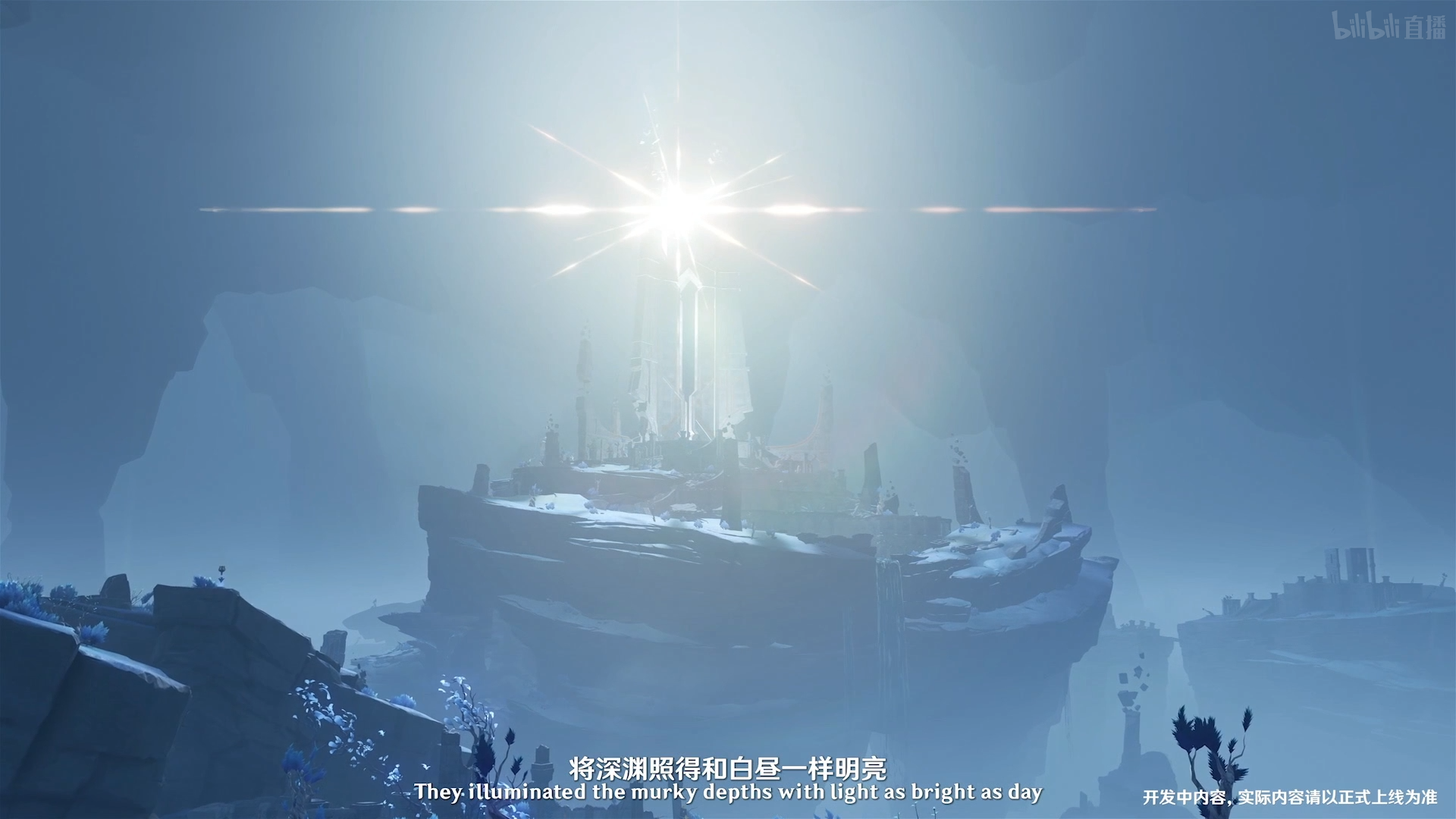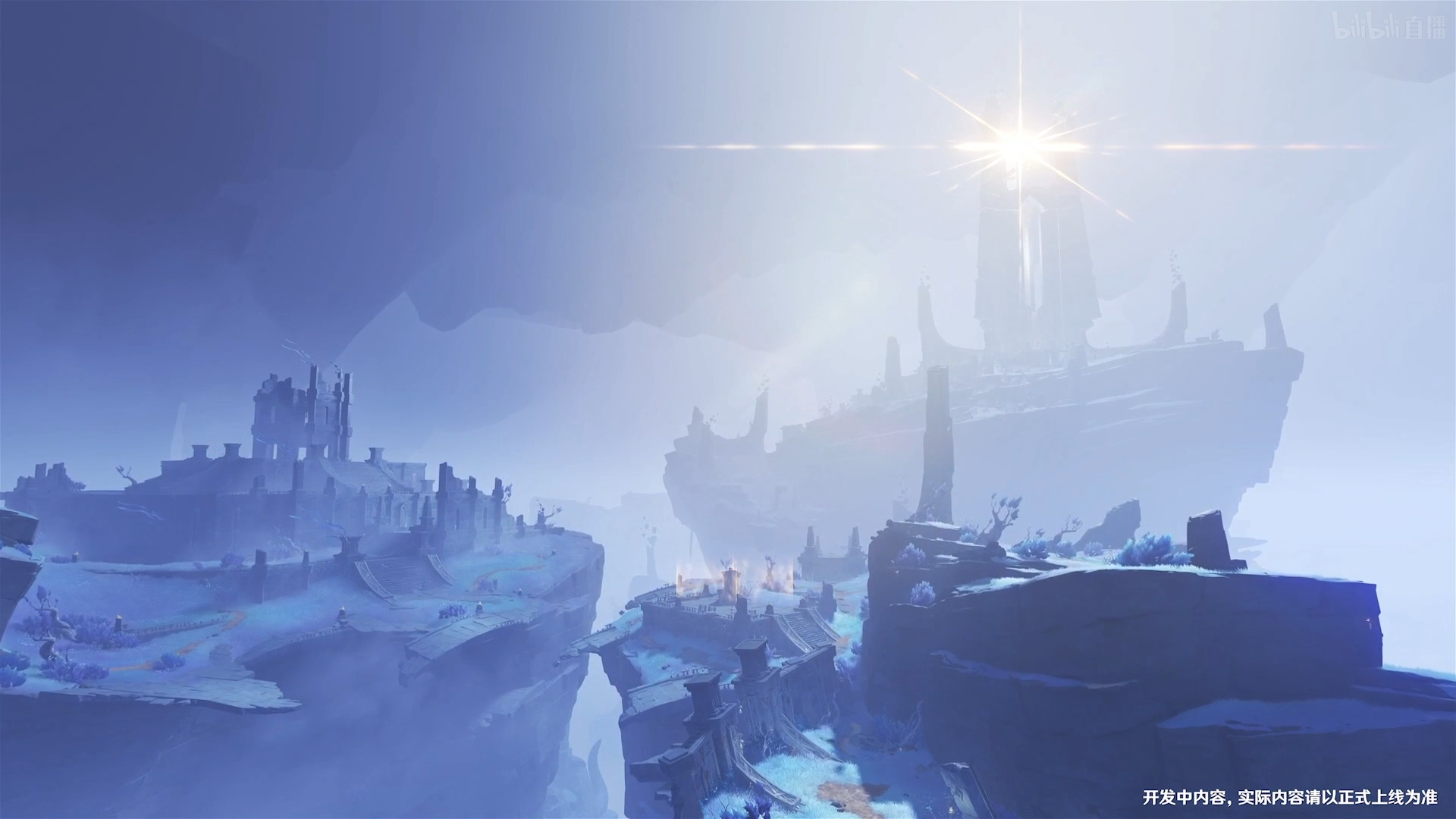 当旅行者越过珊瑚宫下的大漩涡后,首先会经过一段封闭而幽暗的空间,接着倏尔之间,渊下宫广阔的世界便会出现在眼前,破碎的岛屿浮于庞大而虚无的空洞中,远方大日御舆散发出强烈的光晕成为我们视线的焦点。我想到实际游玩时,这一刻一定会非常震撼。