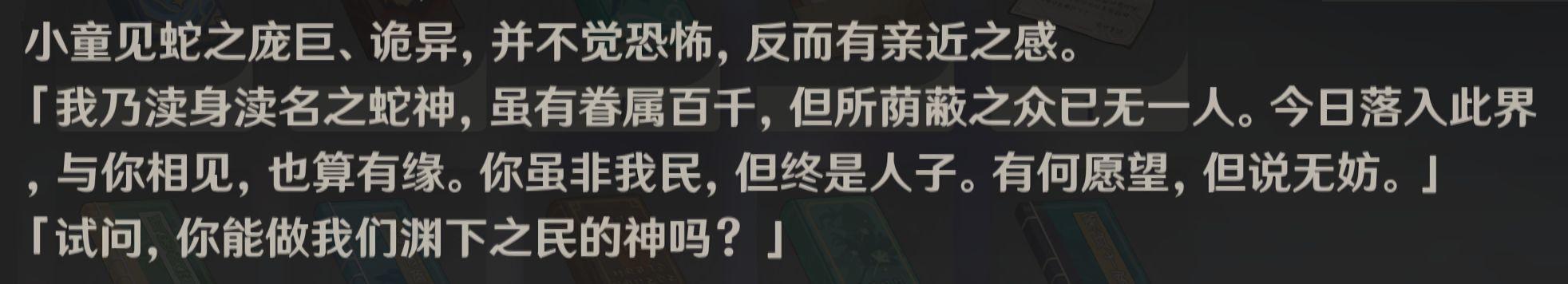 直到无数黑暗岁月后,某位小童在一次采药中邂逅了在魔神竞争中落败、荫蔽之众已不存一人的大蛇。小童并未对面前的庞然巨物感到恐惧,相反心生亲近,觉得彼此有缘的大蛇应允小童许下愿望。