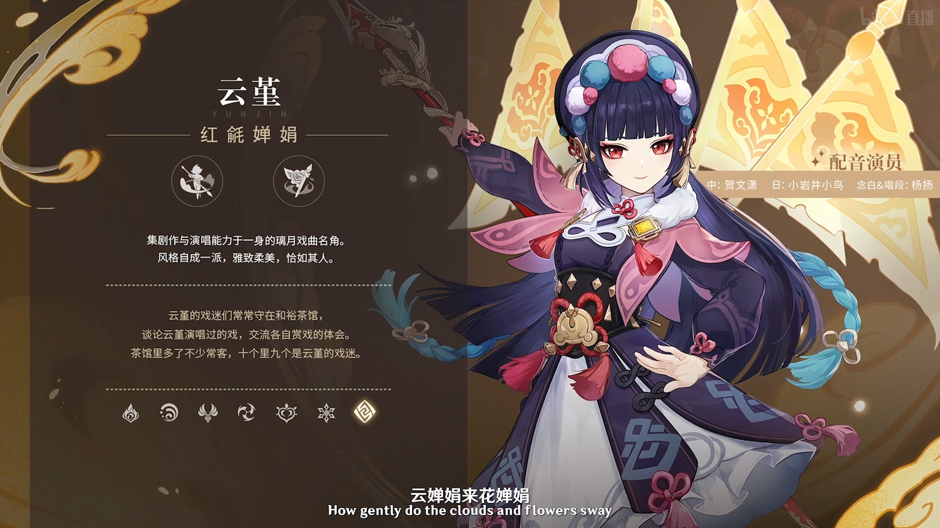 4 w( D2 D1 V8 D8 H- z+ @! r这两位角色相信大家已经非常熟悉了吧(笑)?但这次前瞻直播中的正式展示着实还是让我惊艳到了。尤其没想到新角色云堇不仅在外观动作设计上融入了戏曲元素(京剧靠旗、舞花枪),甚至在语音上也下了很大功夫,一般台词由贺文潇老师负责,角色语音中的戏曲念白和唱段则专门邀请了专业戏曲表演家杨杨老师来进行演绎(这部分四语言版本均保持一致,为中文戏曲唱段)。