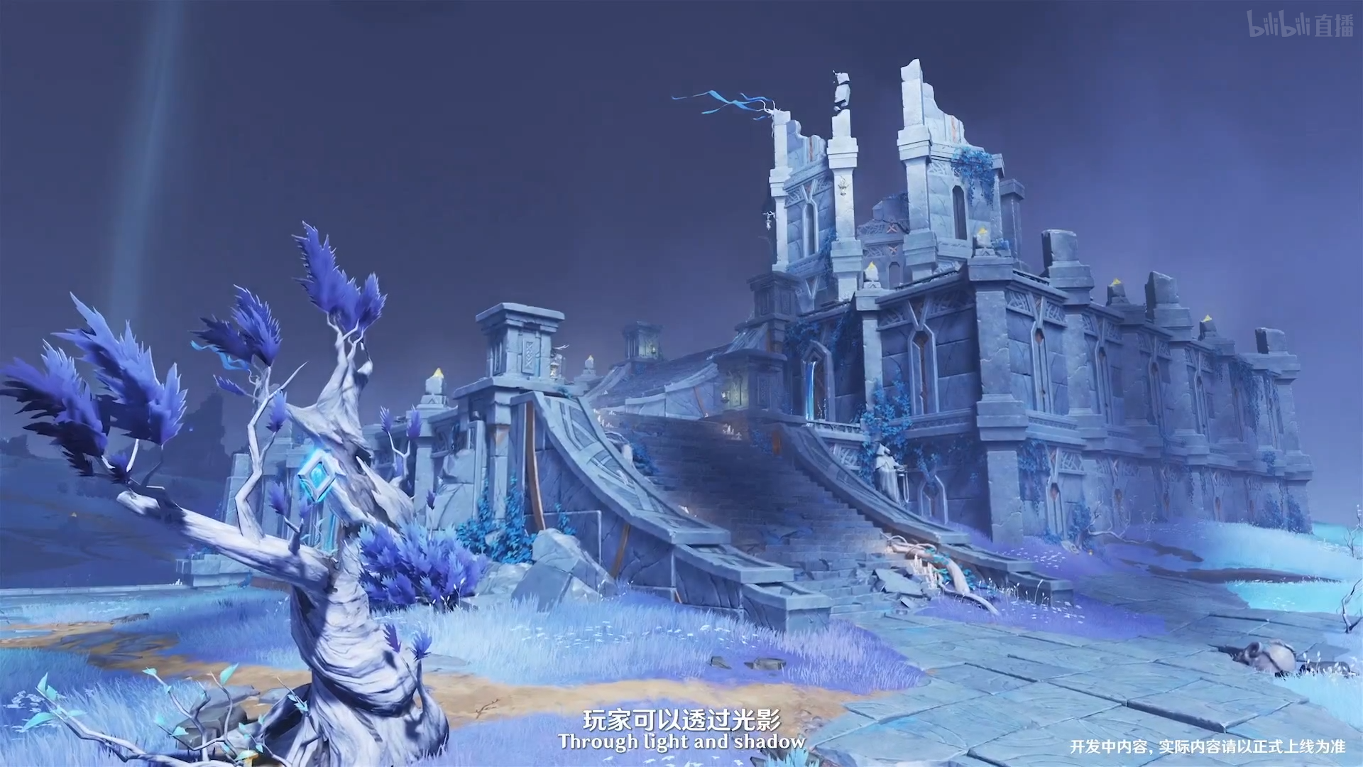 3 e3 v+ T3 I% u* N* H常夜状态下建筑物模糊化成为背景板,凸显的是海渊中的形态各异、散发微光的海底植物,渲染出一种梦幻的氛围。图中展示的是被巨型荧光珊瑚群包围的常夜灵庙,静静流淌的冥河从场景中穿过,共同构成一幅如梦如幻的美丽画卷  ^0 ~0 C; T  j4 ~* s. N0 {5 \
