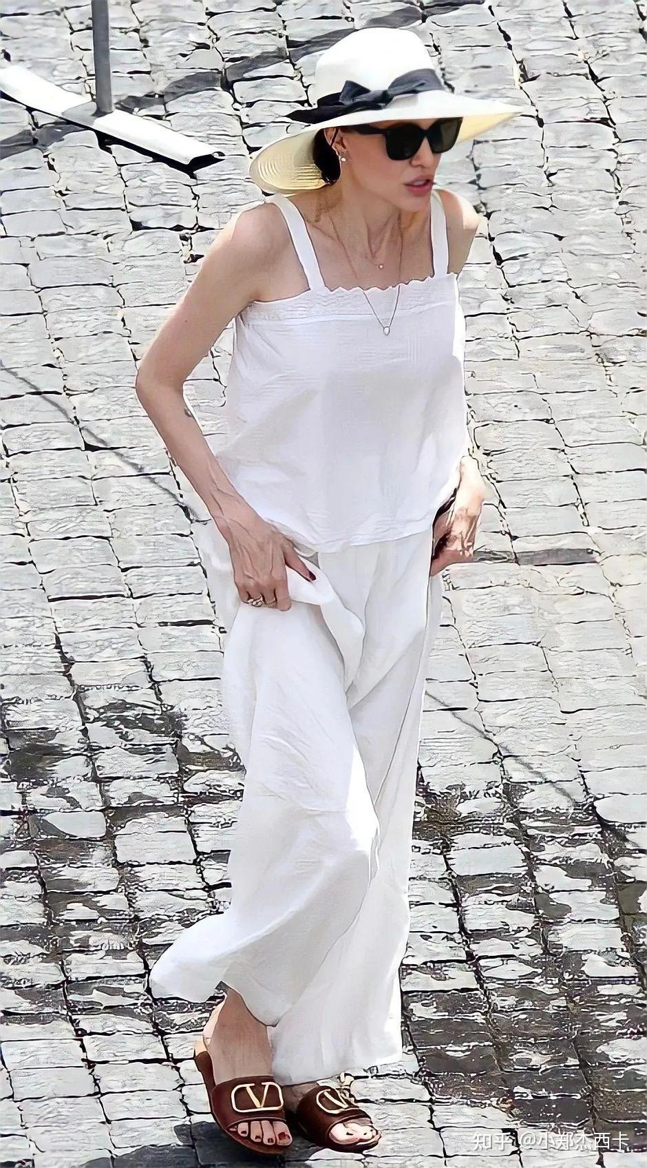 比如参观博物馆时,白裙子配白色小短衫,搭配白色编织包包和拖鞋,低调内敛,随随便便就把半个娱乐圈比下去了。这双拖鞋来自 Valentino,售价约5000元人民币。