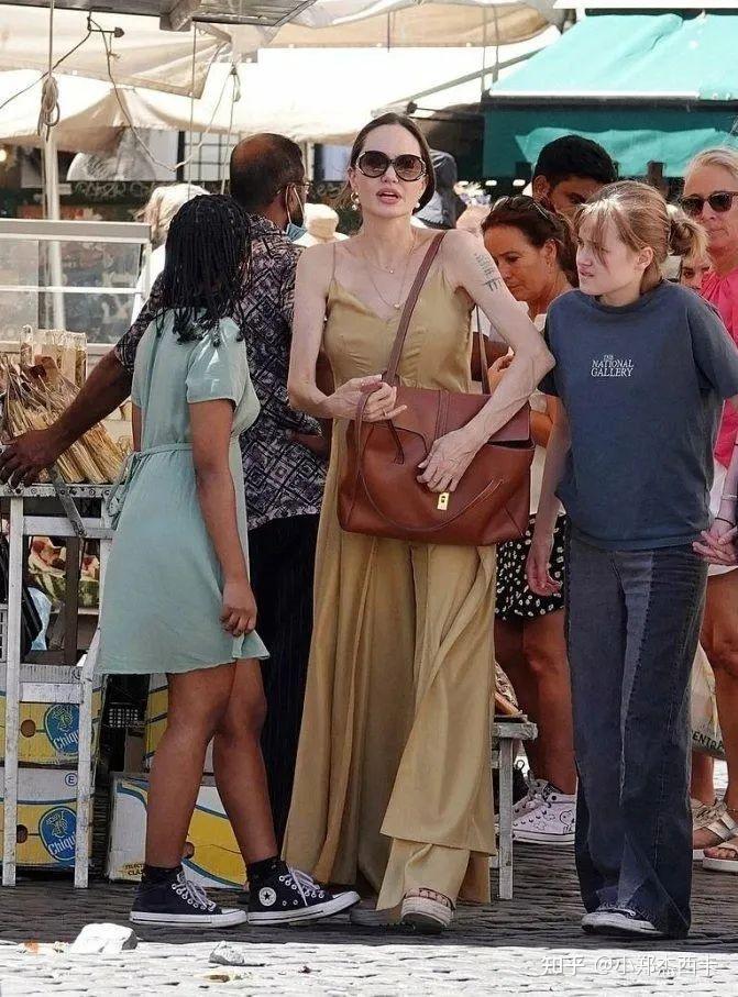 & H+ Q& s; J& A. M6 S朱莉还穿过一身芥末黄Alberta Ferretti 连衣裙,搭配了同款棕色厚底凉鞋和棕色 Celine 大包包。再仔细看,其实裙子里还穿了同款长裤。# r% ~ j" d2 y