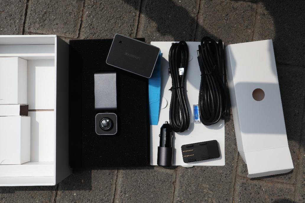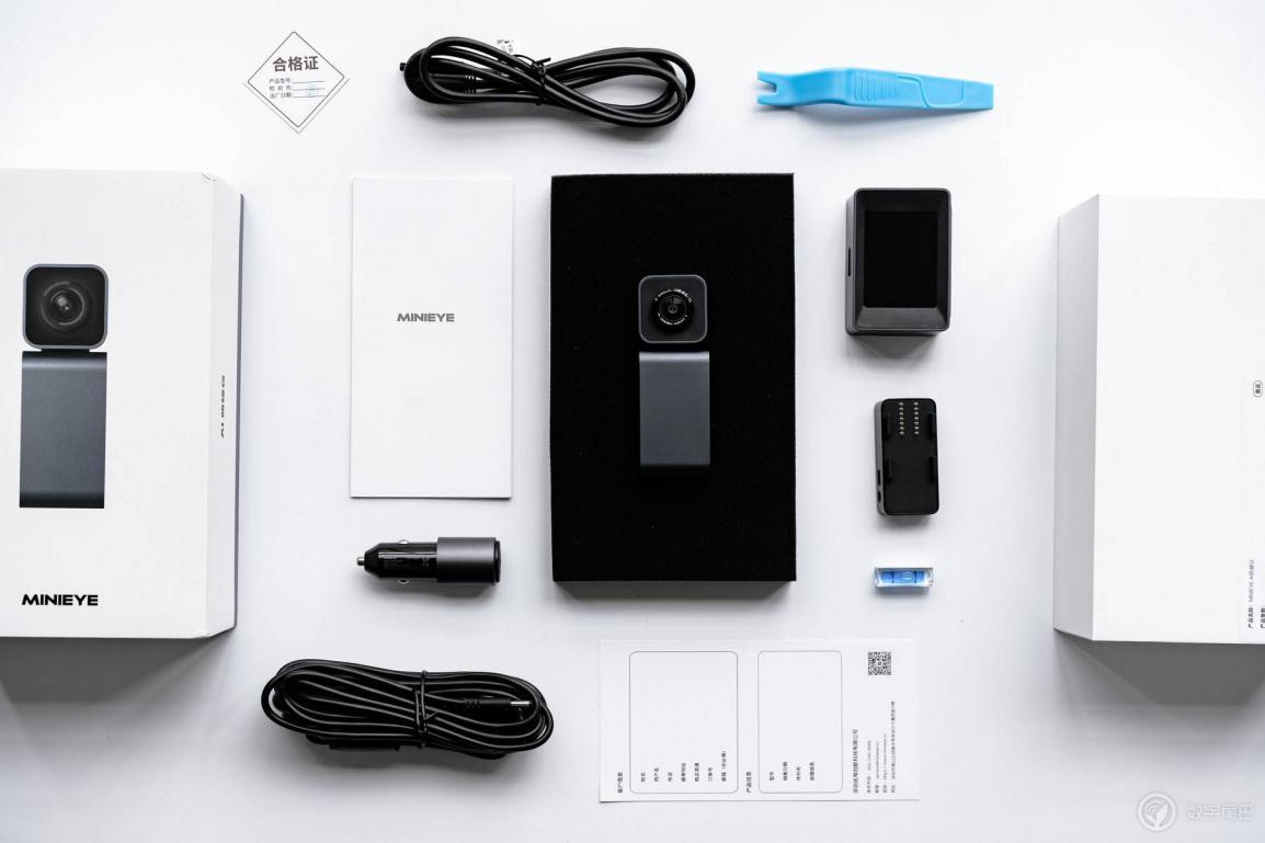 4 l B, B1 y# O第一印象很好,主机很精致而且很有分量,手感也很舒适,产品简约科技范十足。包装盒的背面可以看到MINIEYE AI防碰仪的参数,处理器采用了10nm车载AI芯片,索尼500万像素夜视图像传感器,F1.8光圈140度广角镜头,官方标配防碰仪主机、主机底座、显示器、水平仪、点烟器、翘线器、主机电源线/显示器电源线等。- s p1 Z& ~+ y' K0 a2 b