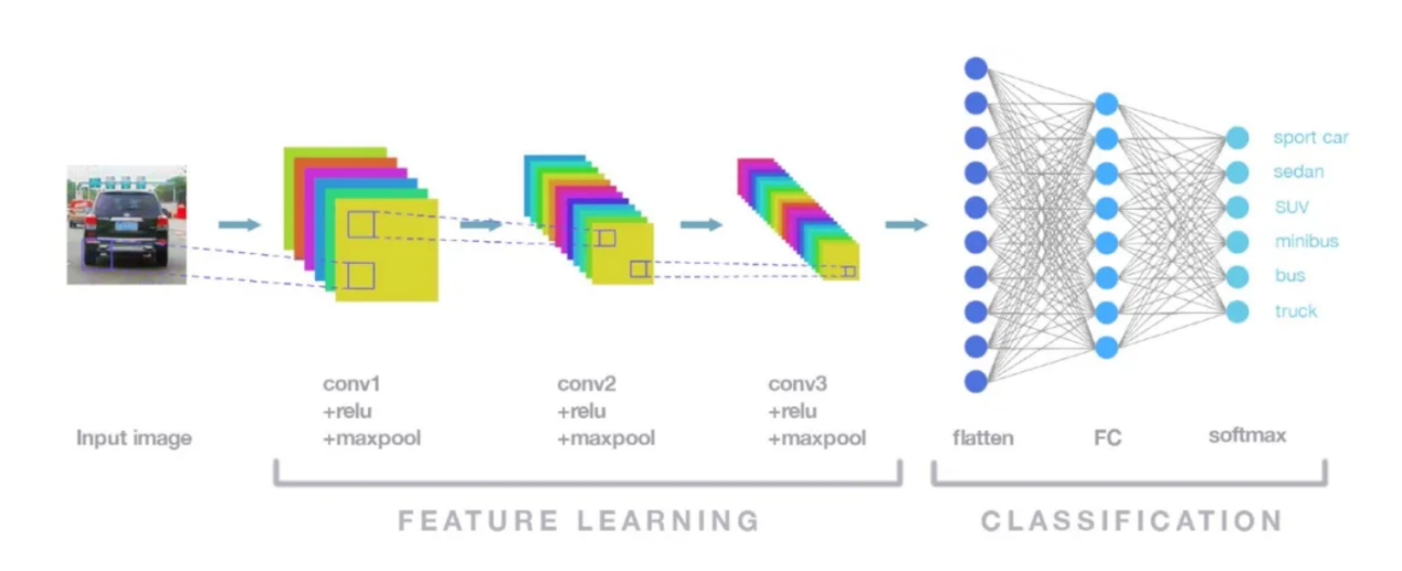 AI防碰仪使用卷积神经网络(Convolutional Neural Network)对画面中的物体进行检测、识别、分类。将采集的数字图像信息输入卷积神经网络: