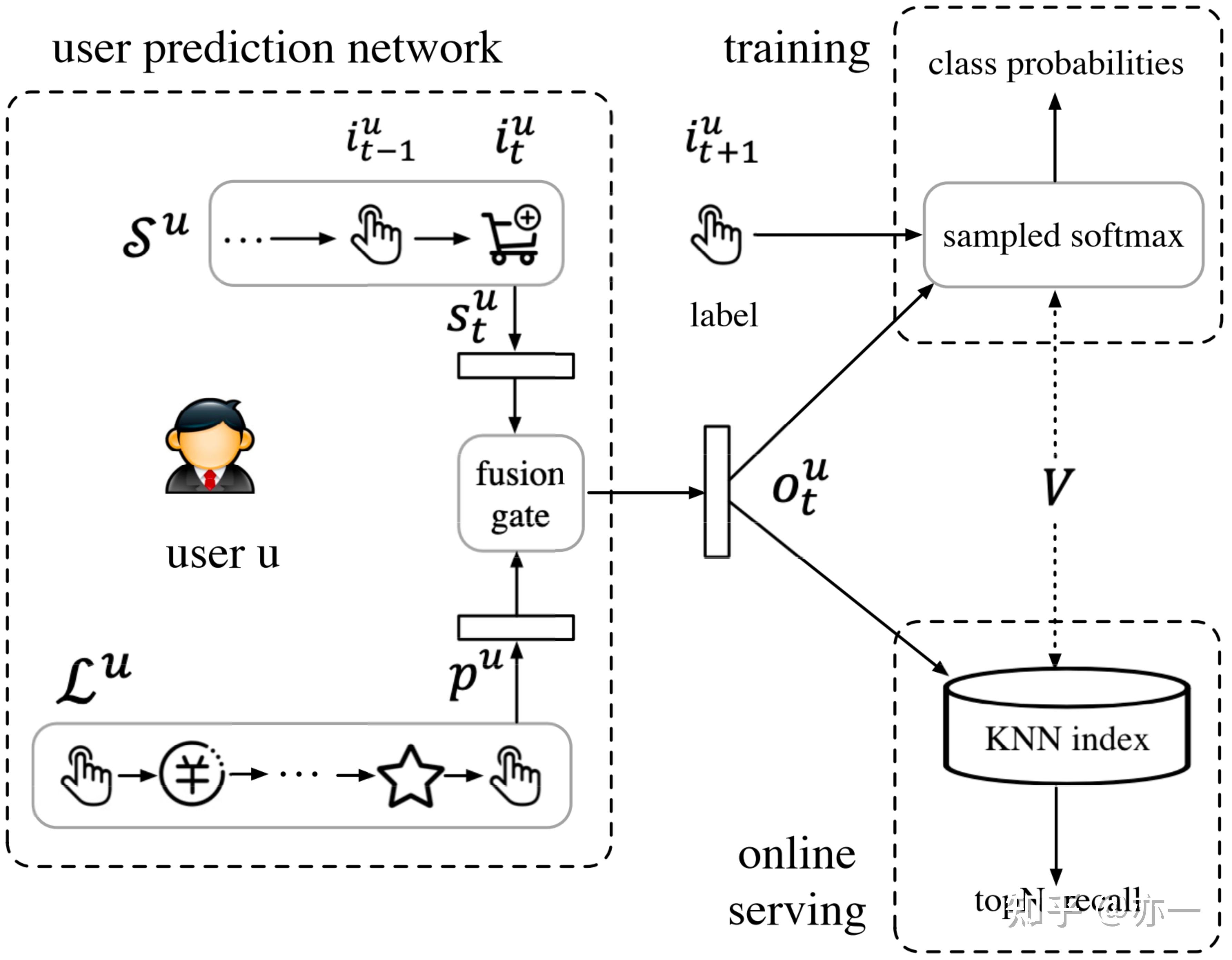 和长期行为序列  作为模型的输入,分别用两种方式对长短期序列建模,得到长期兴趣  和某个时刻的短期兴趣  ,通过gate融合的方式,得到某个时刻的综合兴趣  ,再基于内积相似度从物品库的表征  (其中d为embedding维度,  为物品的数量)中得到最相近的N个物品。/ V* w, k& K( t+ F9 Q& {! [