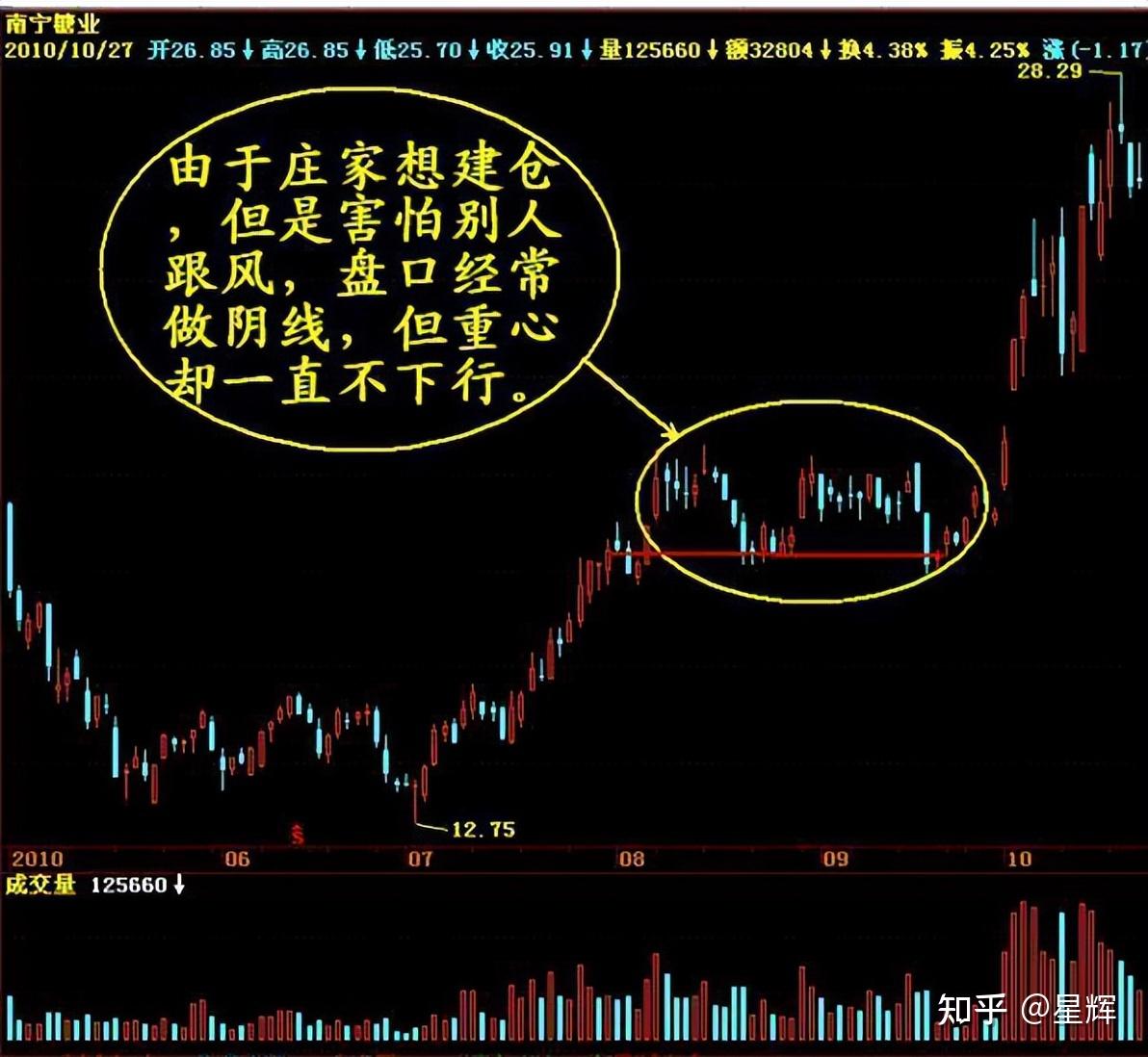 (2)、由于主力想建仓,但是害怕别人跟风,所以经常做阴线,但是重心却一直上行。