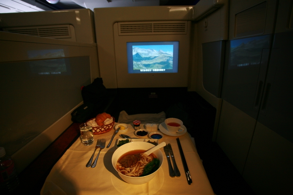(P.S.半夜起床四处溜达的时候碰到威武的乘务长正在头等舱最前面蹲着吃面,顿时觉得挺心酸的,工作真心不容易。一看到我立刻就放下碗站起来问我有神马需要的,我就说我就是溜达一下,你继续吃,没关系。但是乘务长还是把碗收好站在哪儿。。。我就感慨说没事你赶紧吃吧,要不然我都不好意思在这儿呆着了。。空乘工作真心辛苦,没几个职业是这种没点的干活的吧? 支持一下各位飞来飞去的CC们) |