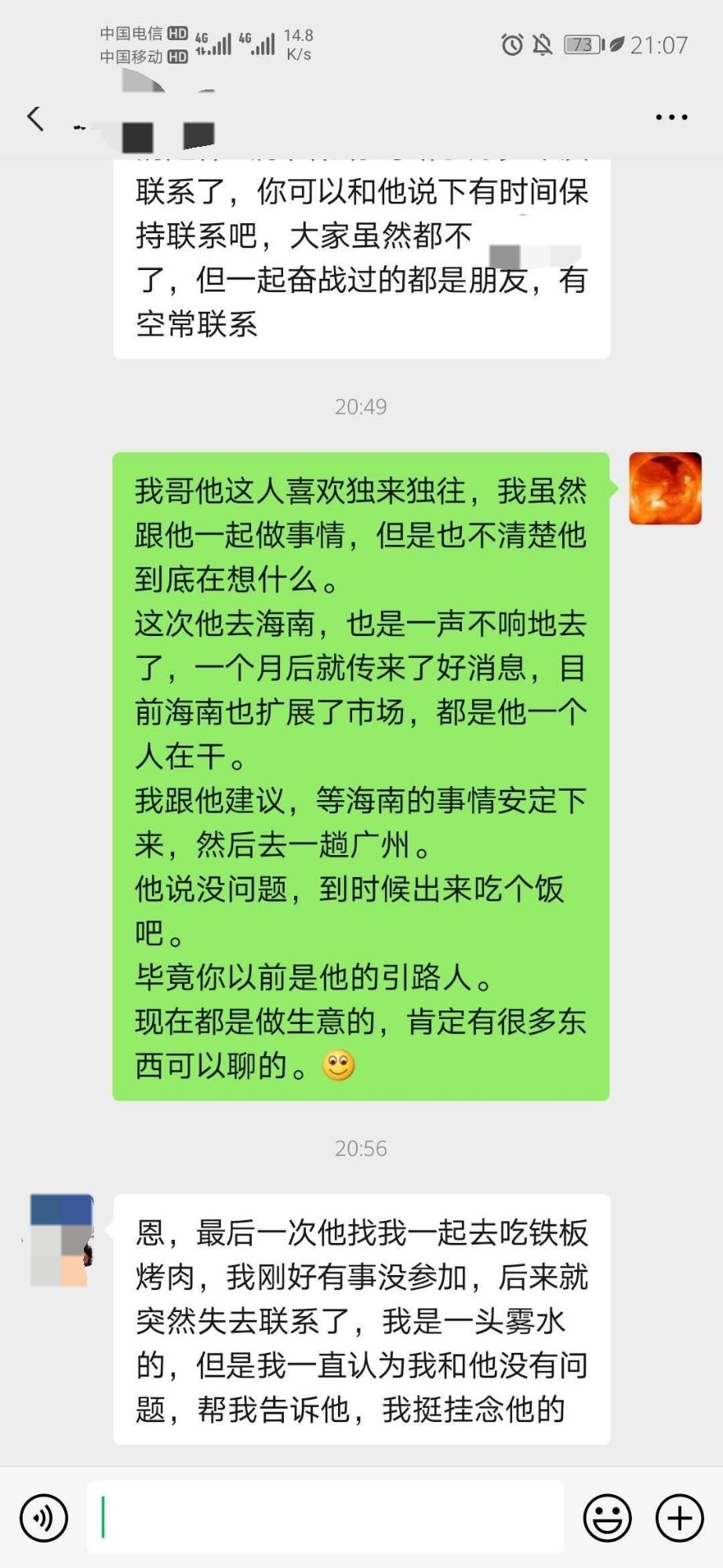 我离职的消息,原本老板不让我说出去。我没有对外公布,但是我退群了,这对群里新来的、以前的同事是一个比较震惊的消息。因为他们没想到,这样的一个老大竟然会离职,而且那么悄然无息,那么决绝。