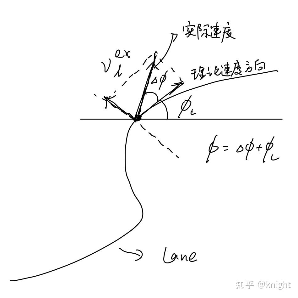 其中 表示车道本身的角度, 表示期望的前进角, 类似的,也是一个增益, 表示转向角, 表示汽车重心到前轮的距离,我推导了一下感觉跟论文中的表述不太一样,更详细的关于运动汽车的建模可以参考下文: