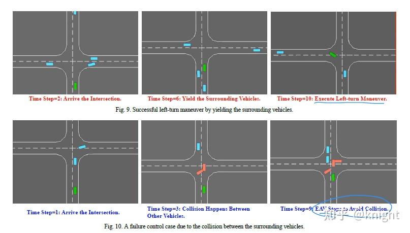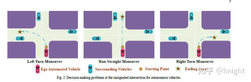 & ]" }+ U' ?& T+ n 在四通路口下,所有车辆遵守通行权规定,无信号交叉口的通行权有四层:level4:水平直线移动和右转;level3:垂直直线移动和右转;level2:水平左转,level1:垂直左转。这里需要解释一下什么是水平垂直,从驾驶员视角来看,自己始终是处于垂直位置的,所以这个通行优先权的意思就是你得先让别人过,自己先等等。而该问题中的垂直左转处于通行权最低的情况,所以策略本身就应该是先减速或停止再转弯,避免碰撞的情况下尽可能快地到终点。% X6 `' b1 Y$ F% a+ |9 J8 C& F