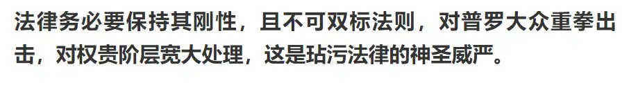 6 l& C8 Y' Z2 j" f/ r如果我们的道德、法律、人性底线这些东西,共同构建出来的文明框架体系,不能让守规矩者得利,反倒是对于那些泼皮无赖权贵阶层卑劣分子没辙,那么这文明框架,就不会是真的“和谐”。