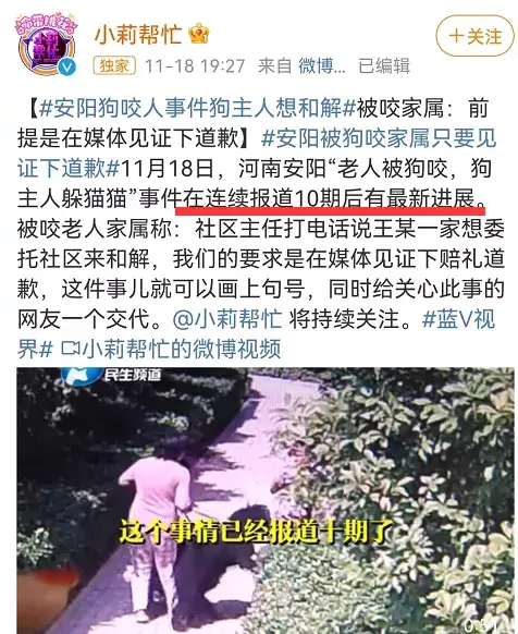 7 P. G( W3 c4 L11月18日,河南安阳“老人被狗咬,狗主人躲猫猫”事件在连续报道10期后,终于有最新进展。