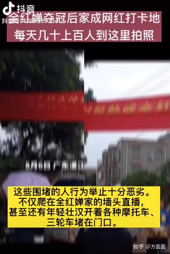 全红婵家的房子周围,被里三层外三层的人和手机镜头围了起来,形成了一个天然的“直播间”。现实中,不仅各种“远房亲戚”上门,让全红婵妈妈惊讶地发现“原来家里有这么多亲戚”;