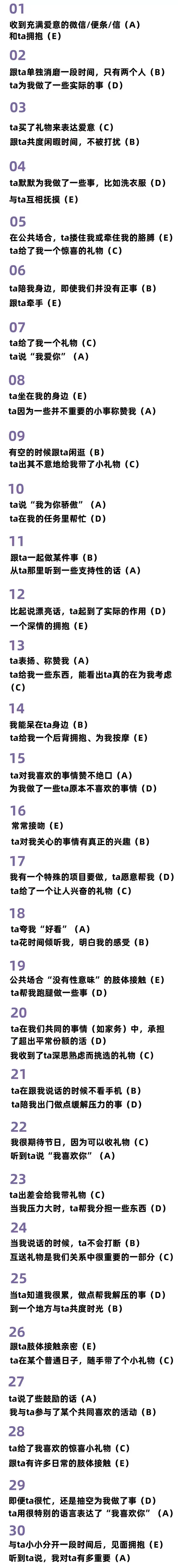 . d4 c, S# K7 T. i' S+ v统计这些字母各自的占比,就能知道自己的“爱情语言”了。这些字母的对应关系为: