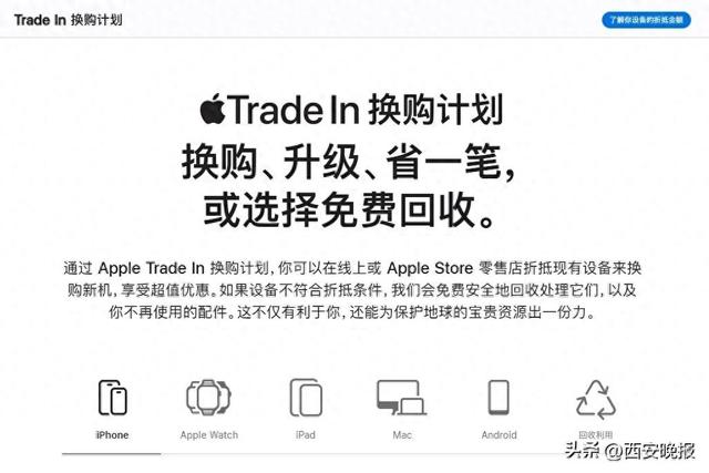) G/ P( ^3 T; t2 y9 A据苹果官网,折抵换购服务由Apple的折抵服务合作伙伴提供。折抵金额报价仅为预估价,实际折抵金额可能低于预估价值,具体金额取决于设备的状况、配置、推出年份,以及发售国家或地区。年满18周岁及以上者才可参与本计划。现有设备的折抵金额可用于折抵购买新的Apple设备。