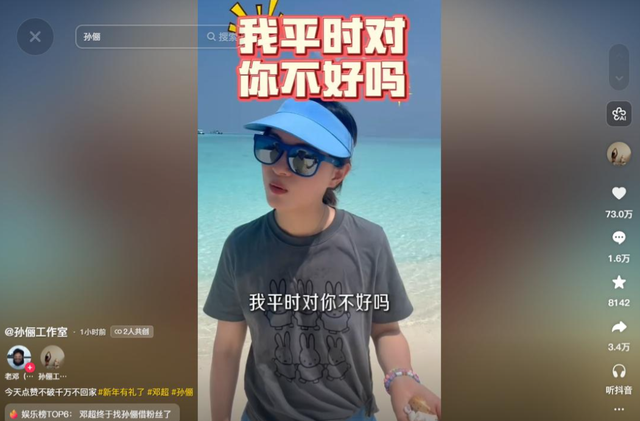 1 N5 t* P! x4 w' W. `$ s" X E这事儿说起来有点好笑,邓超新号注册才20天,就更新了18条视频,这更新速度,专职博主都得汗颜,他涨粉的路子也格外清奇,主打一个到处借,找刘涛借粉送了人家一幅她看不懂的毛笔字,找李现借粉搞了个抽象表情包,这次直接升级,跑到海边沙滩,堵着正在捡贝壳的孙俪当面借粉。4 p8 Z& z, z, z T9 h! b3 r5 }